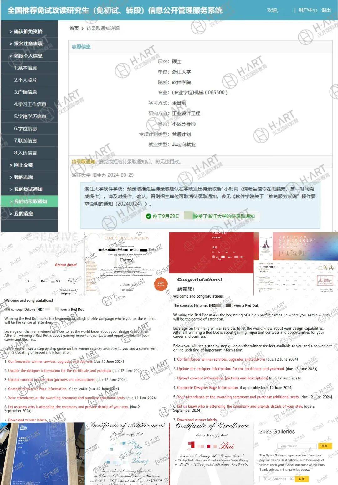 获得2项红点、ADesign、戴森设想中国区八强、美国星火国际设想、Gcross国际设想、iai全球设想菁英、日本cada等数十项设想获 西南交大 设想学、深圳大学 设想学、西安电子科技大学 机械、安徽大学 艺术设想、南京农业大学 机械、华南农业大学 艺术设想、广东工业大学 设想学 保研登科;正在国内高校中的推免配额几乎封顶。